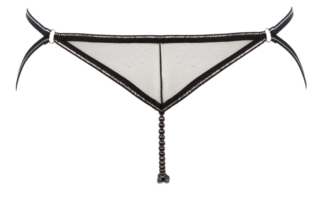 Thong made of recycled Italian lace, super sheer tulle, elastic silver lurex straps and silver appliqués. The most innovative garment of the Manhattan Collection, combining the minimalism of a thong and the classicism of a brief.