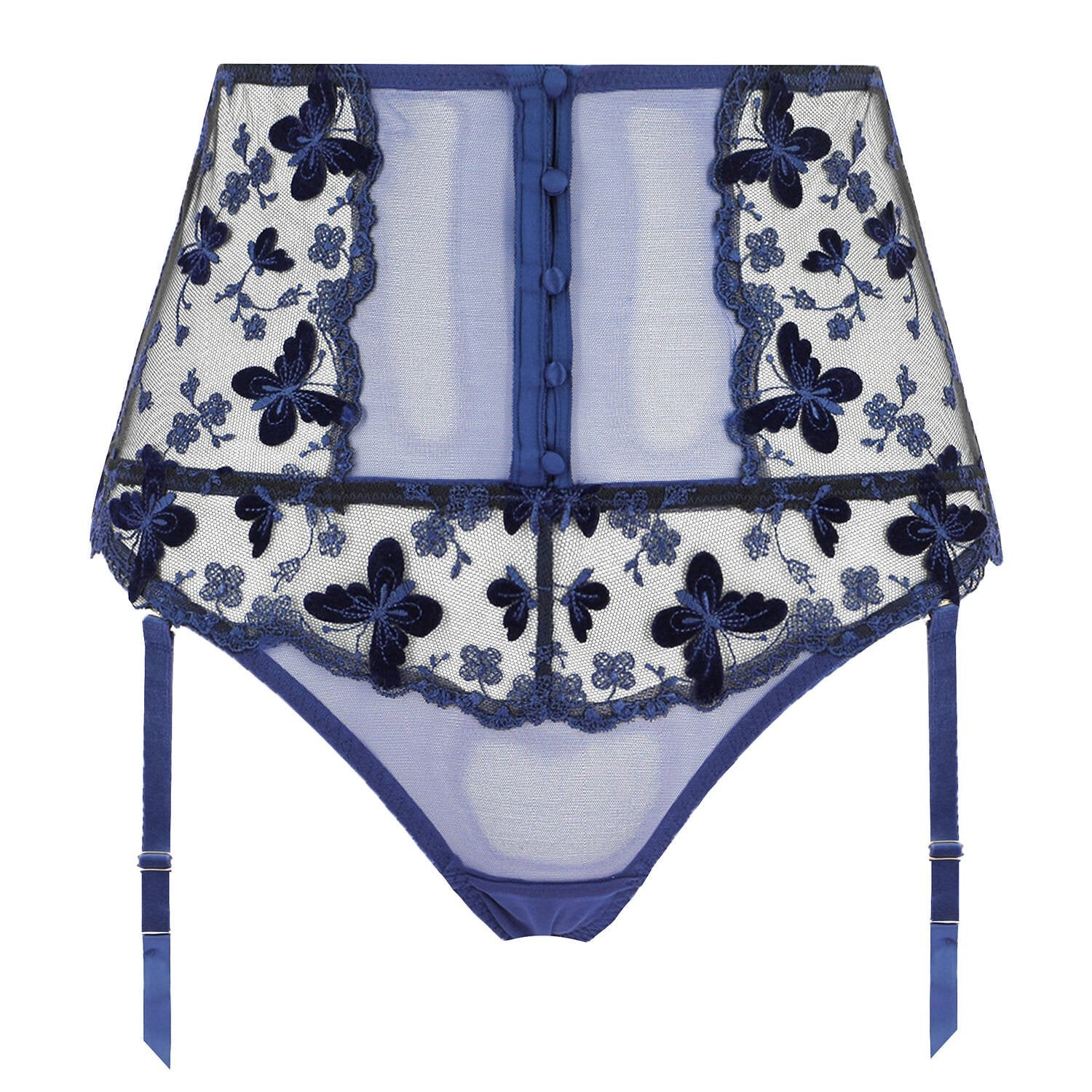 The exquisite Papillon High Waist Brief showcases the perfect fusion of delicate fine tulle and intricate imported floral embroidery, with meticulous attention to detail.  Adorned with velvet butterflies, gracefully resting on enchanting flowers adding a touch of ethereal beauty.
