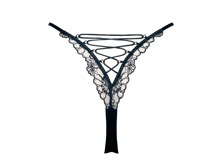 The back stuns with a corset-style lace-up detail, finished with a luxe leather-like cord that brings an edgy contrast to the soft, romantic embroidery. Complete with our signature rose gold metal hardware, this thong is the perfect balance of elegance and bold design—ideal for layering or showcasing.