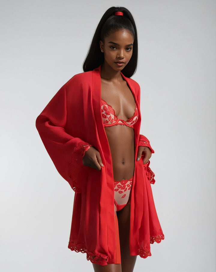 A satin tie-belt cinches the waist for a flattering, customizable fit, while playful red lip embroidery along the hem and cuffs adds a bold, flirtatious touch. Whether styled over your favorite Marian lingerie set or worn solo, this exclusive design invites confidence, elegance, and allure.
