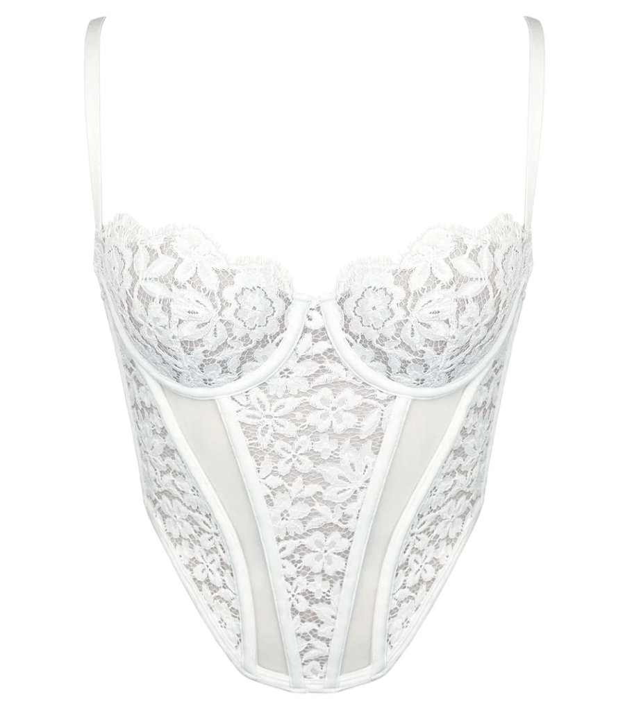 Experience luxury with the Frisson Corset. Crafted from carefully sourced guipure eyelash lace made of recycled nylon content, this corset offers comfortable shaping with flexible underwire and rigid tulle lining for superior support and sculpting. Finished with rose gold nickel-free metal adjusters on adjustable corset straps in the back, you will feel sophisticated and elegant in your luxury lace statement piece.
