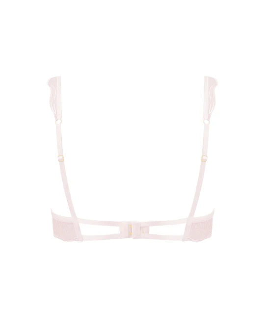 The Marabel Embroidered Sheer Bra in pearl pink is a lingerie masterpiece, boasting delicate, directional embroidery and scalloped edging. This embroidered sheer bra offers subtle plunge cups, an underwired construction and is perfect for everyday elegance. Complete the set with the Mirabel panty.